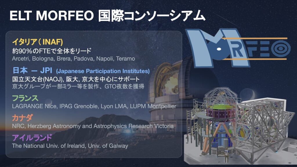MORFEO は、欧州南天文台がチリに建設中のELT 望遠鏡に搭載される補償光学装置です。補償光学技術は、地球大気の乱流が作り出す星像の歪みをリアルタイムに補正することで、地上の大型望遠鏡の光学性能を最大限に引き出したシャープなイメージング観測を可能にします。MORFEO は、近赤外線カメラ・分光器であるMICADO と連携することで、宇宙望遠鏡を遥かに凌駕する解像度で遠方宇宙の天体の構造を明らかにします。私たちはこのMORFEO の開発において、大型の反射鏡およびレンズの製作を担っています。この開発で用いられる高精度な鏡面計測・加工技術は、国際先導の枠組みを超えて、TMT望遠鏡をはじめとする次世代大型装置開発にも適用できる重要な要素技術です。